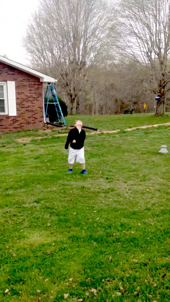 Boy shoots Nerf gun at the camera, the dart / bullet ricochets off the lens and hits man back in the eye. Bonehead.