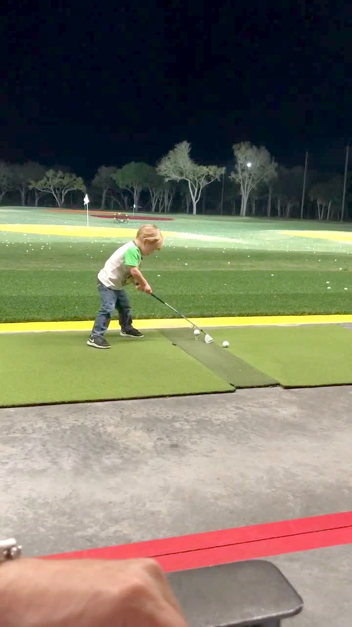 A tot boy throws a golf ball after he misses several times when he tries to hit it with a club at a driving range at night.