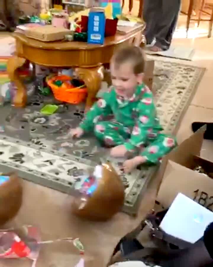 A young boy picks up a large plastic egg and jumps on it because he thinks it's a balloon and he can pop it, but the egg breaks in half and he falls over onto the floor.