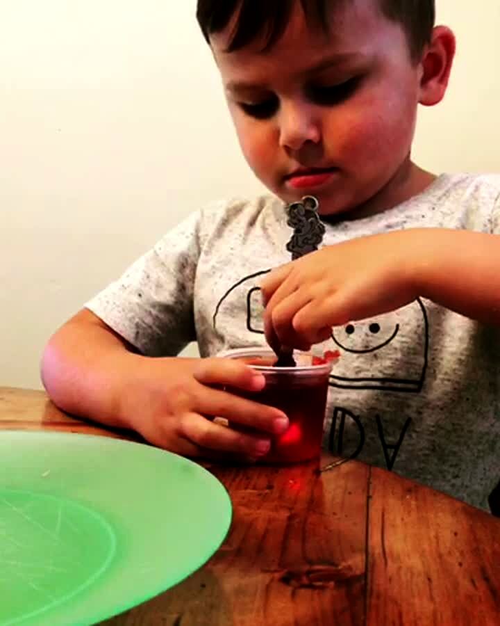 A young boy eats Jello. His mom startles him as he goes to take a bite and he drops the Jello in to the floor.