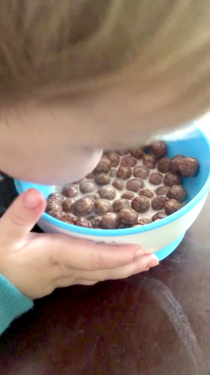 A tot boy presses his face into a bowl of cereal and eats from it in the living room. He pulls on it to pick it up, but it is suctioned to the table. He pulls harder and the bowl comes off the table and spills the milk and cereal on his face.