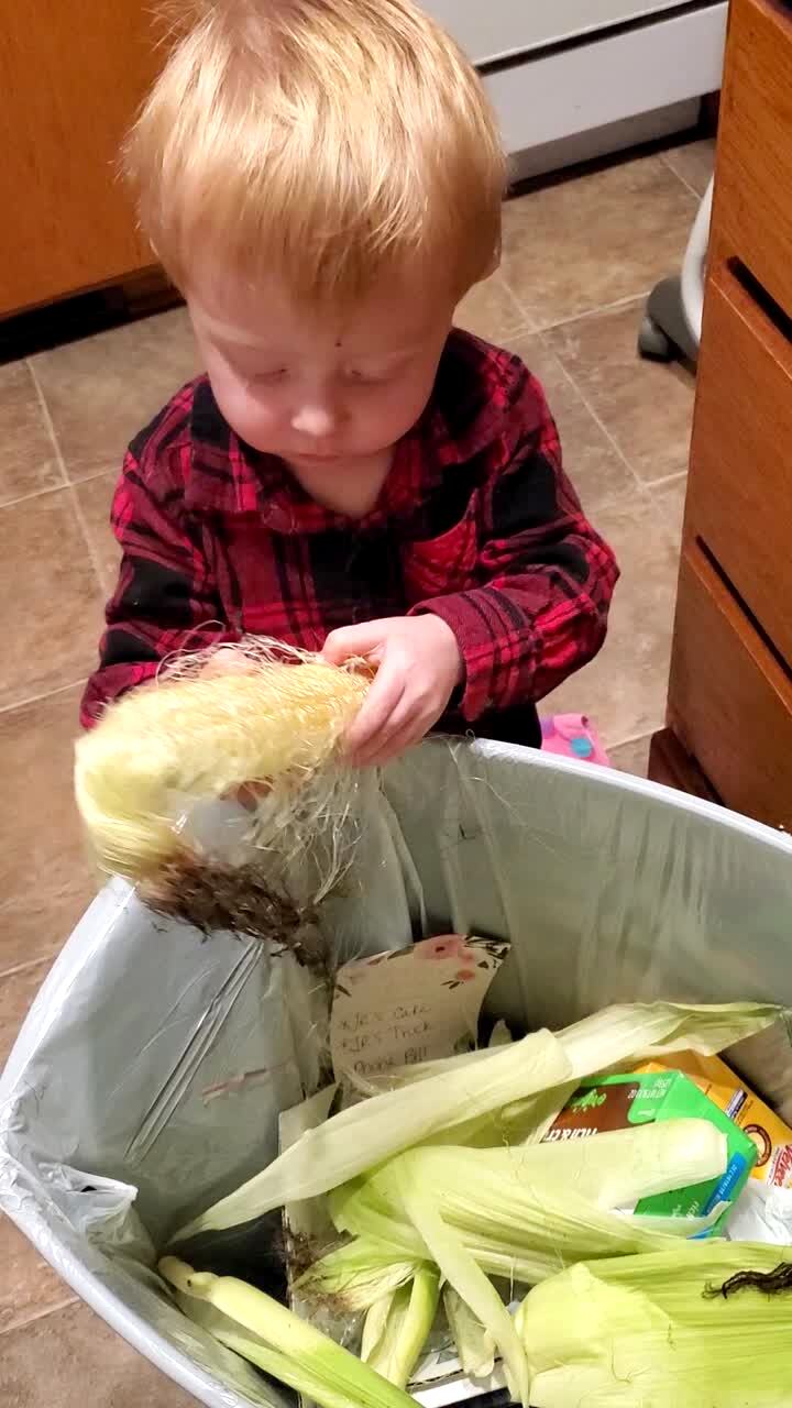 A tot boy shucks corn over a trash can and decides to take a bite, but then his mom tells him he can't eat it yet so he throws it in the trash.