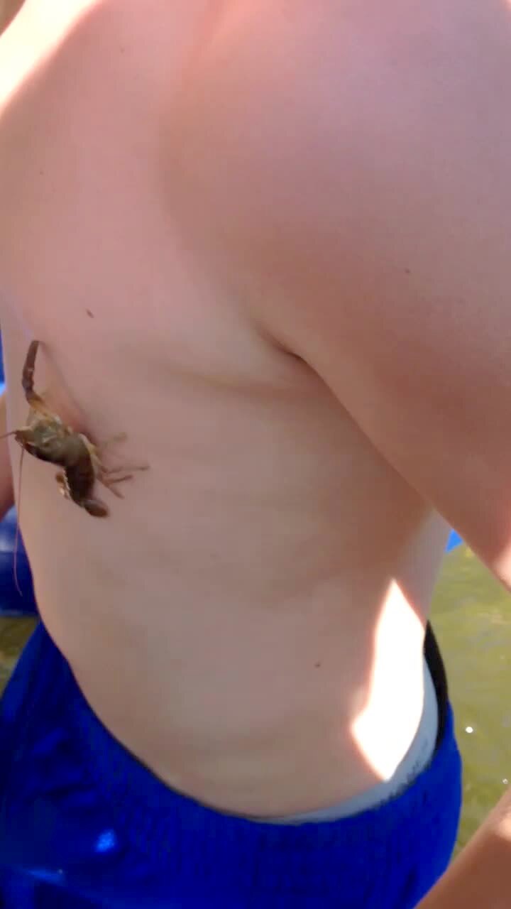 A boy screams while standing in a creek outdoors after a crayfish holds his nipple between its claws. He brushes it off and continues to scream.