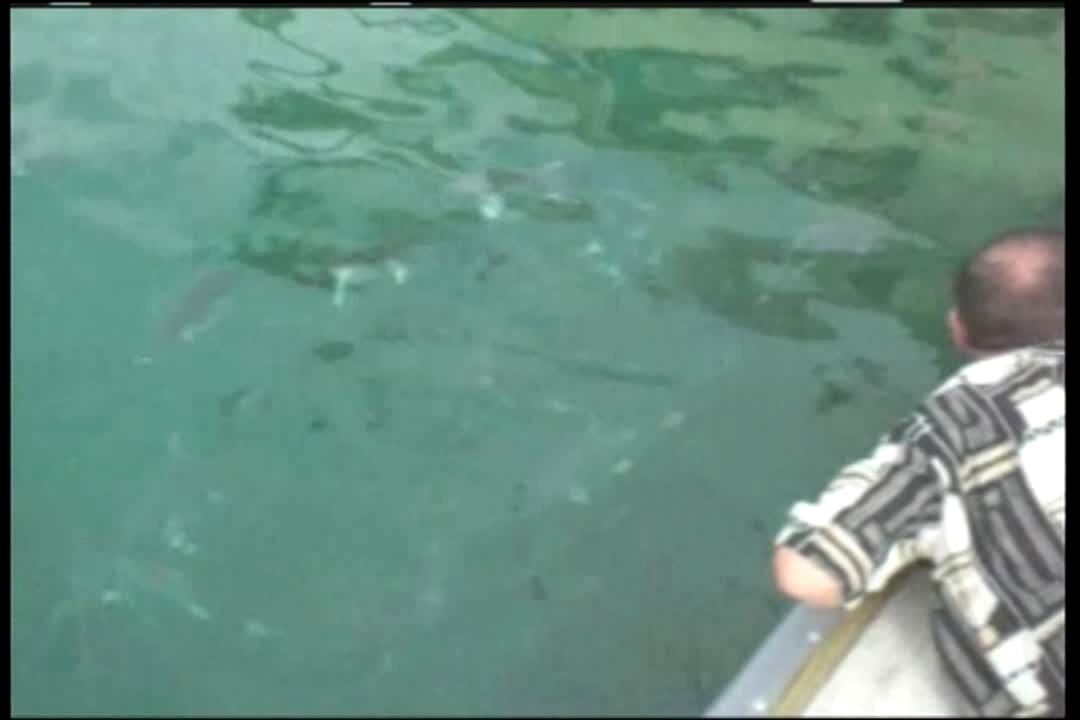 A teen boy walking along a dock dives into the lake below and emerges with a giant fish in his arms. After posing for the cameras the teen releases the fish back into the water.
