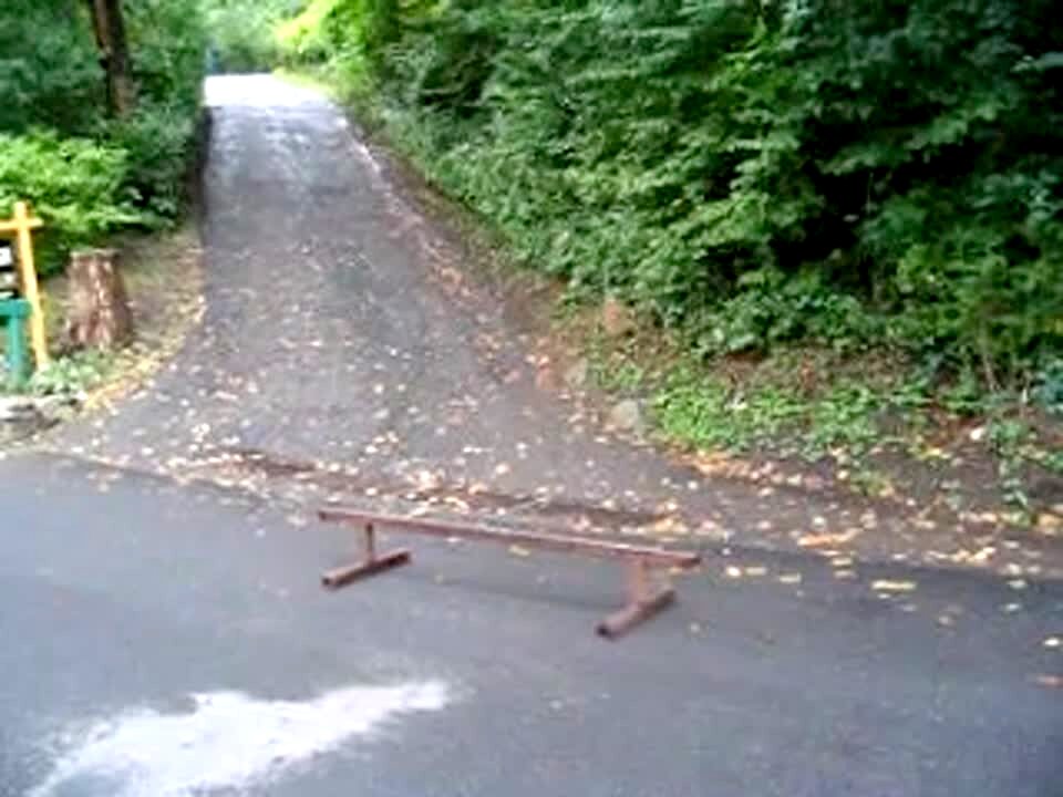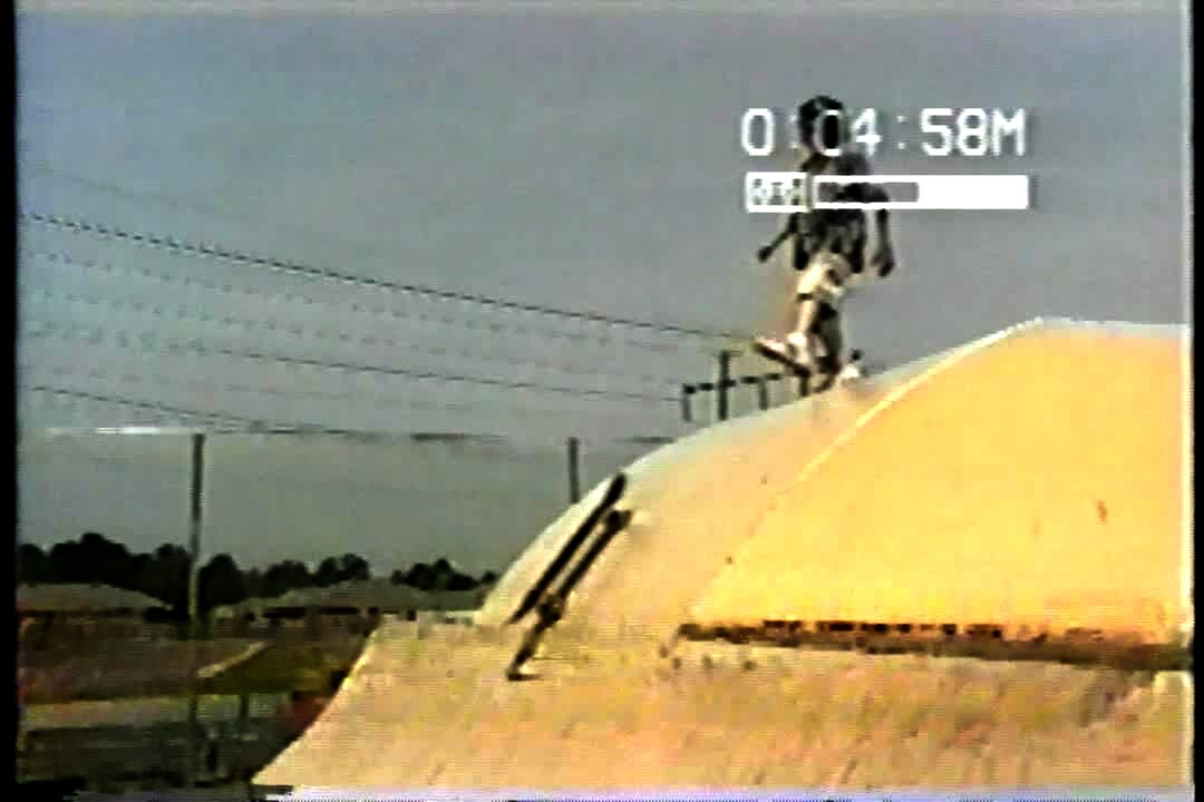Boy goes off a jump on his skateboard 3 times & hangs onto a fence. On 3rd try, the fence breaks & falls down. Boy walks away. Good recovery.