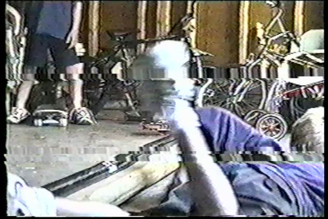 Boy jumps onto railing on his skateboard, tries to do a rail slide. Skateboard breaks in half & boy falls onto ground. No recovery. NO TAILS.