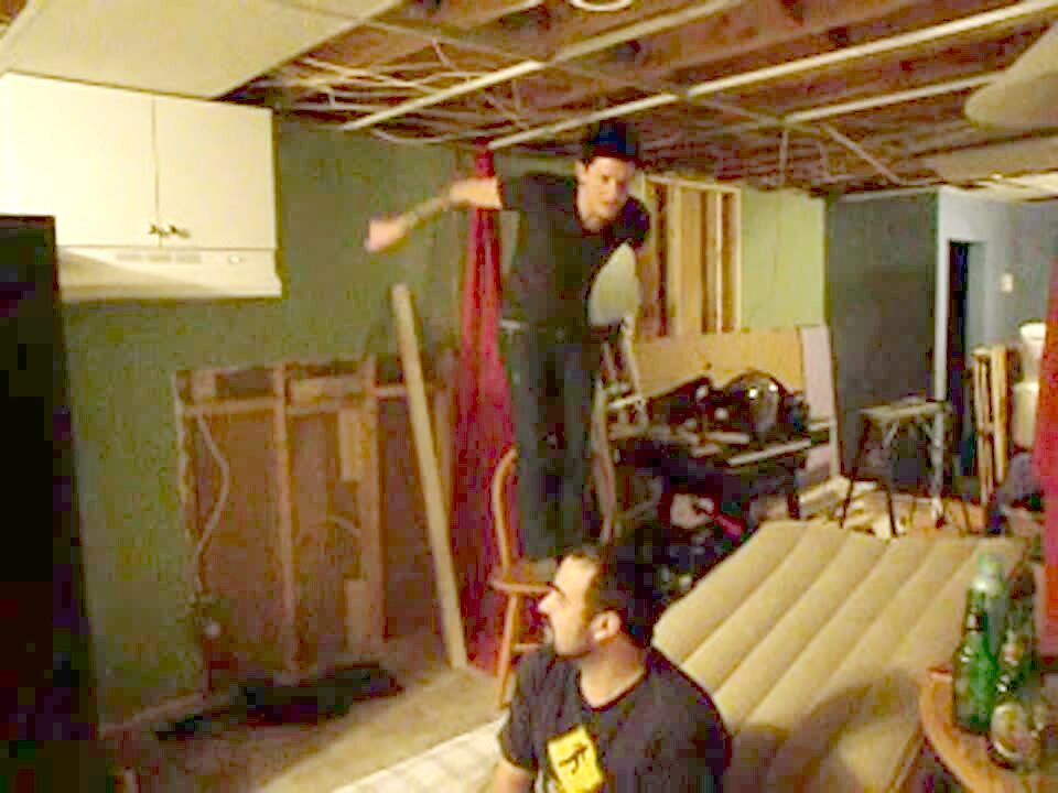 Teen boys set up guitar and amp in sleeping friend's room and play really loudly to scare him & wake him up. Surprise, practical joke. Dorm.