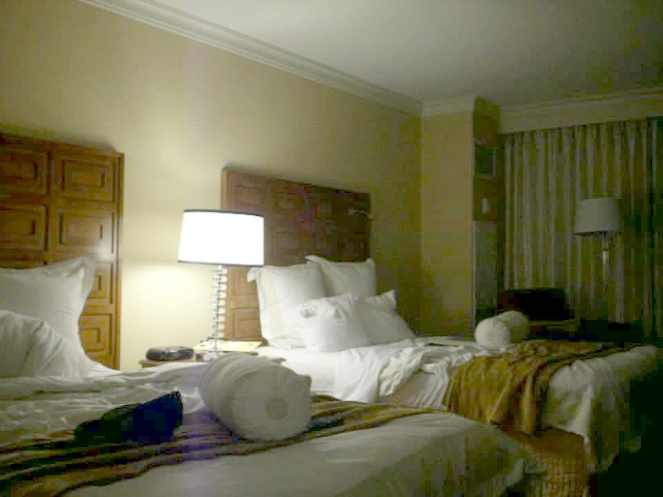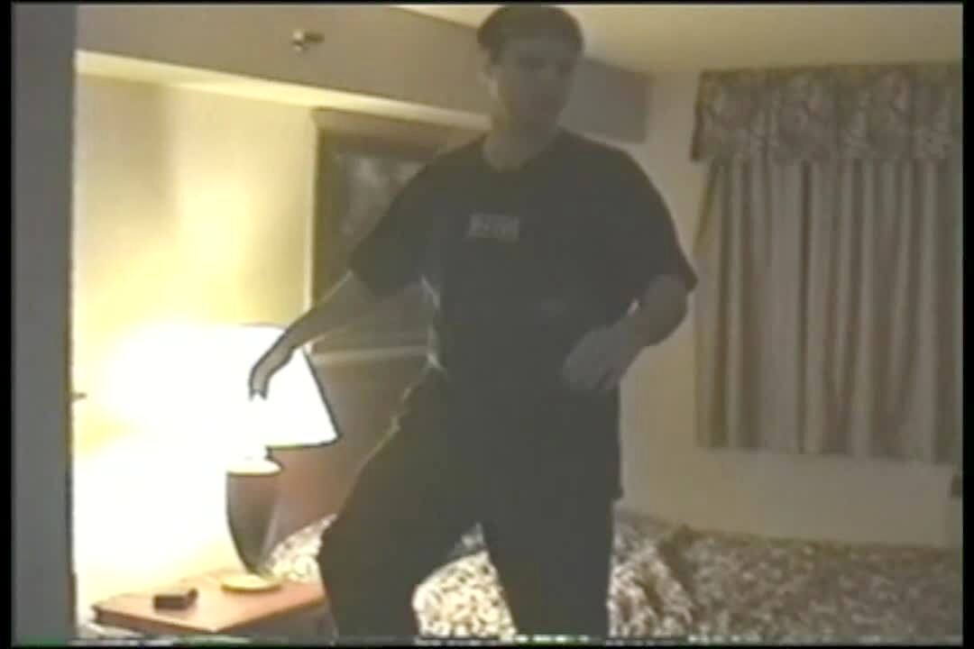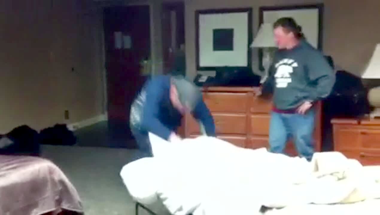 Young man does back flips from one hotel bed to another. He says "this will be the best one yet" & falls in between the 2 beds. Bonehead.