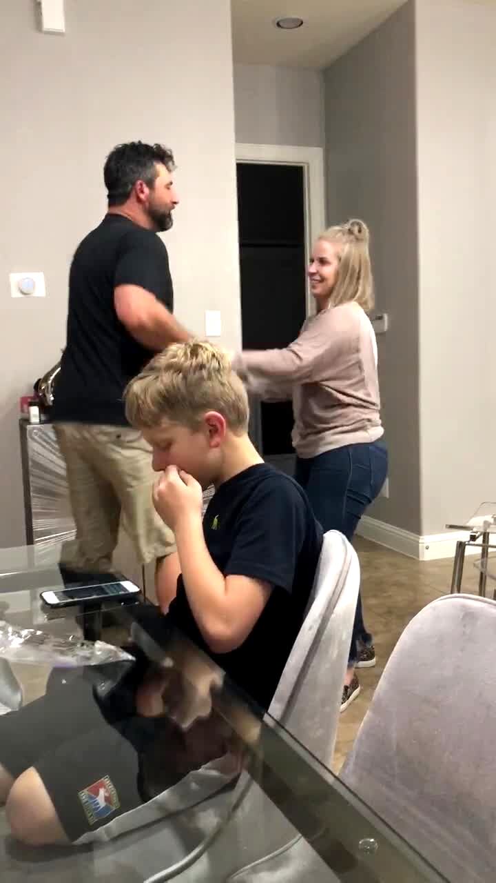 A man hits a chair in the dining room and falls as he tries to act out the clue, "Doing a Backflip" on the game Heads Up.