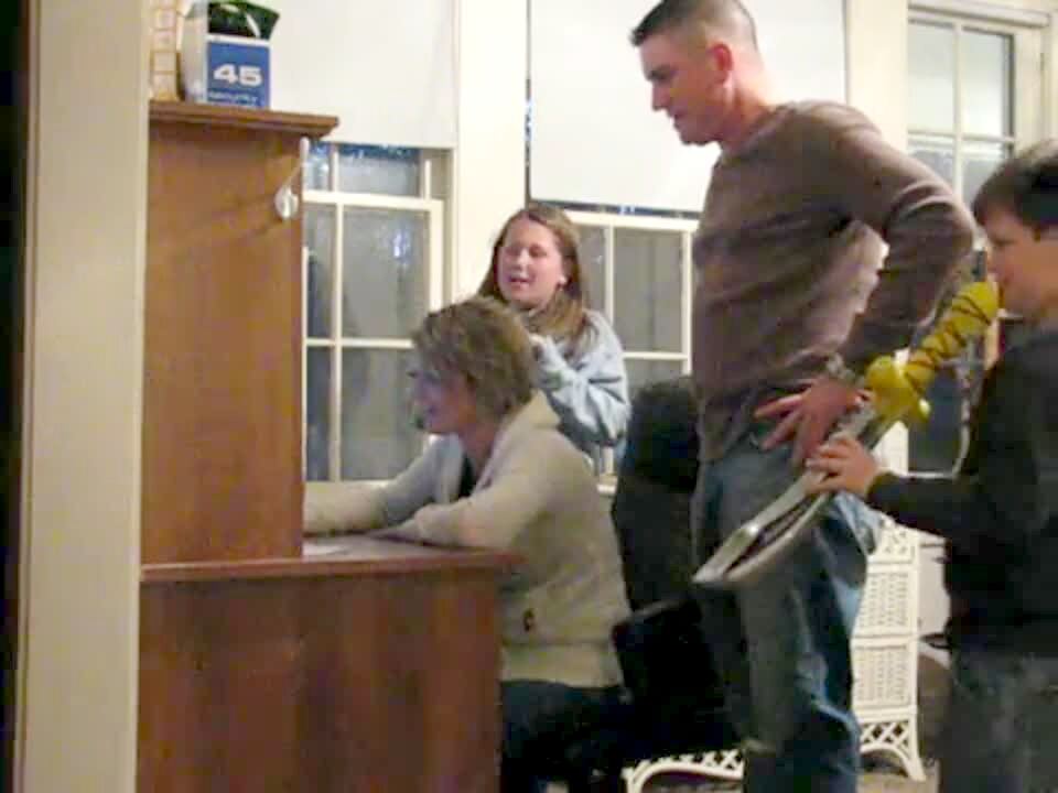 Practical jokes; son drops big fake spider on mom when she goes up stairs, mom screams. Mom is in nurse's outfit.