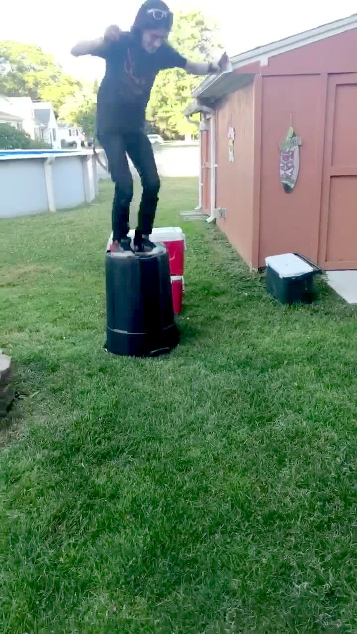 Boy tries to jump over camera on trash can in driveway, knocks garbage can and camera over.