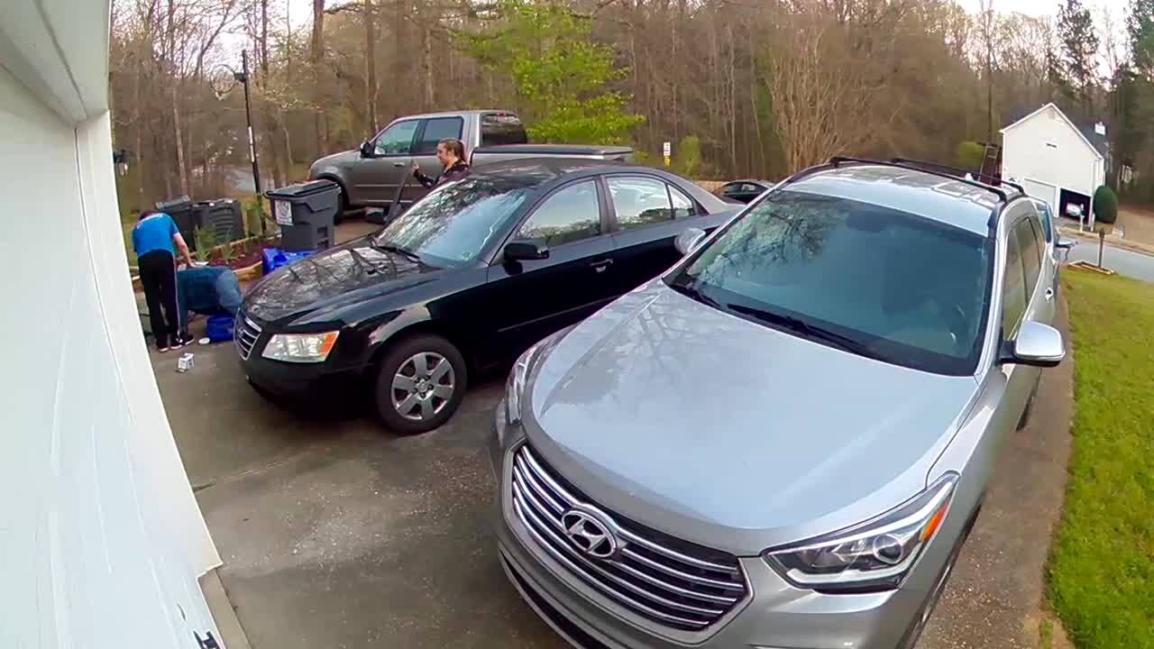 A teen boy lifts a heavy trash bag in the driveway outside of the house and throws the bag over his shoulder and falls backwards into the garage door. Security-footage.
