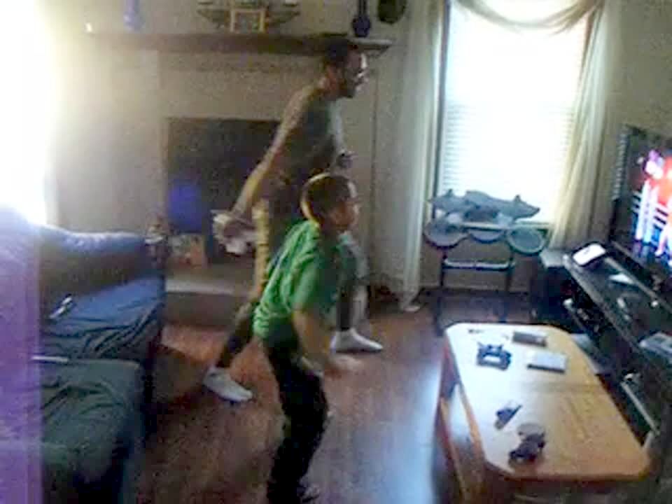 A young boy hits his father in the face off screen when he wakes him up while he wears a skull mask.