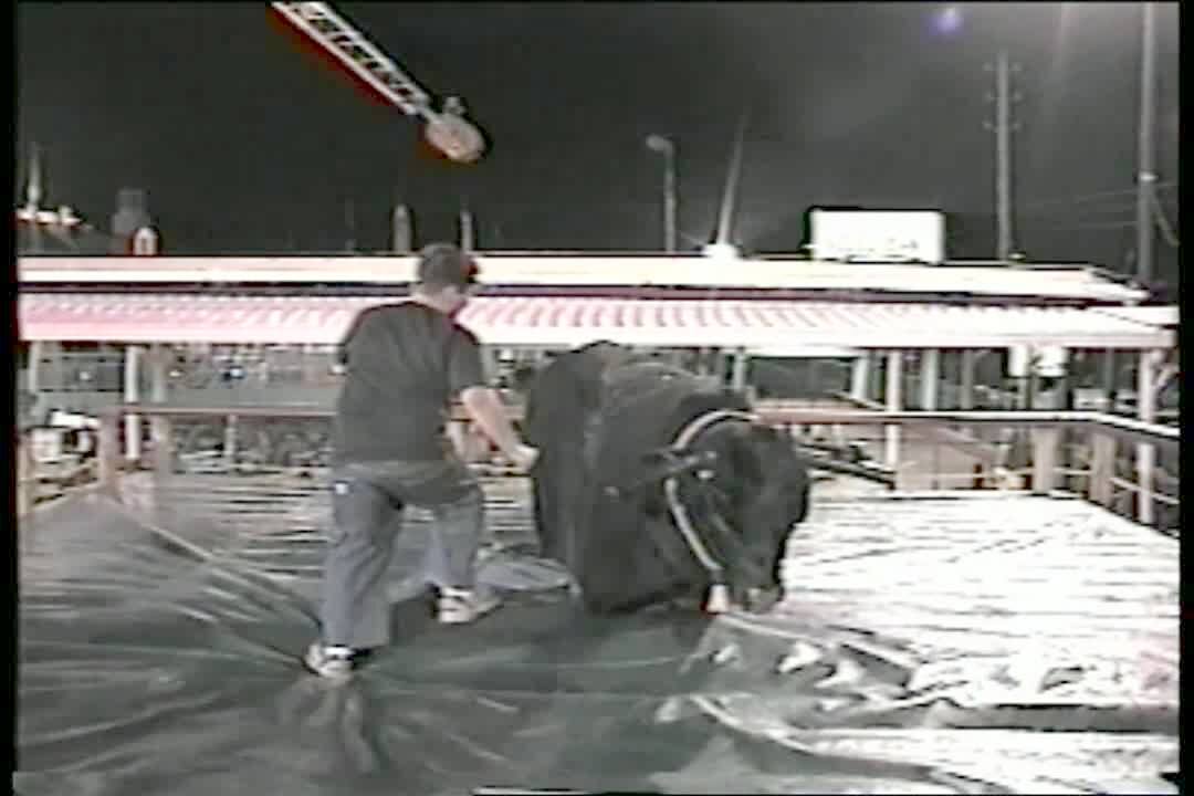A young boy attempts to ride a mechanical bull but falls off then gets nailed into by the bull, as he flies out of frame.
