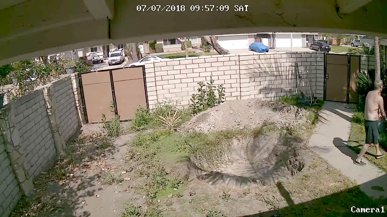 A man mows a lawn and falls into a large hole in the yard. He looks around, confused, then gets back up and continues to mow. Home security footage.