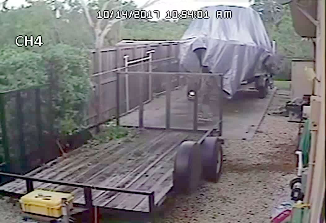 Security camera footage of a man who stands on a trailer in the yard and leans off the edge to trim a bush, but he loses balance and falls into the bush. No audio