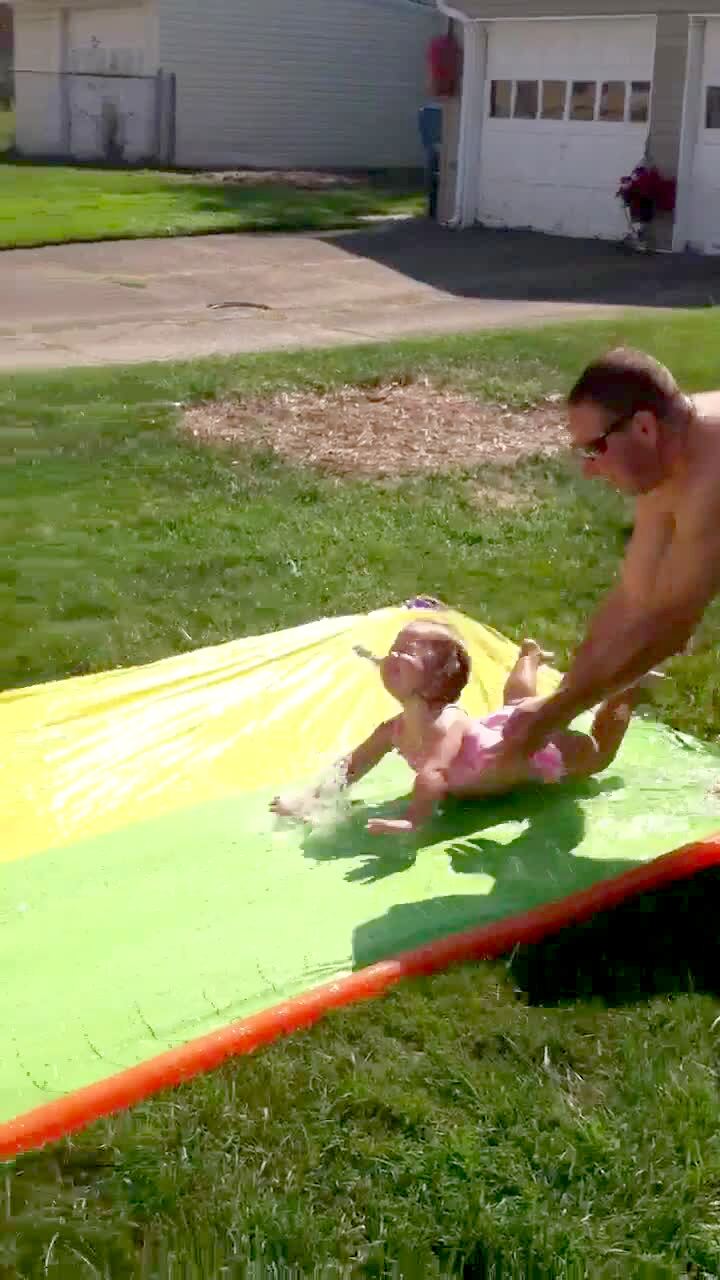 Dad films little boy & girl riding a red Power Wheels car in the garage. They run dad over & he screams "owww". Siblings