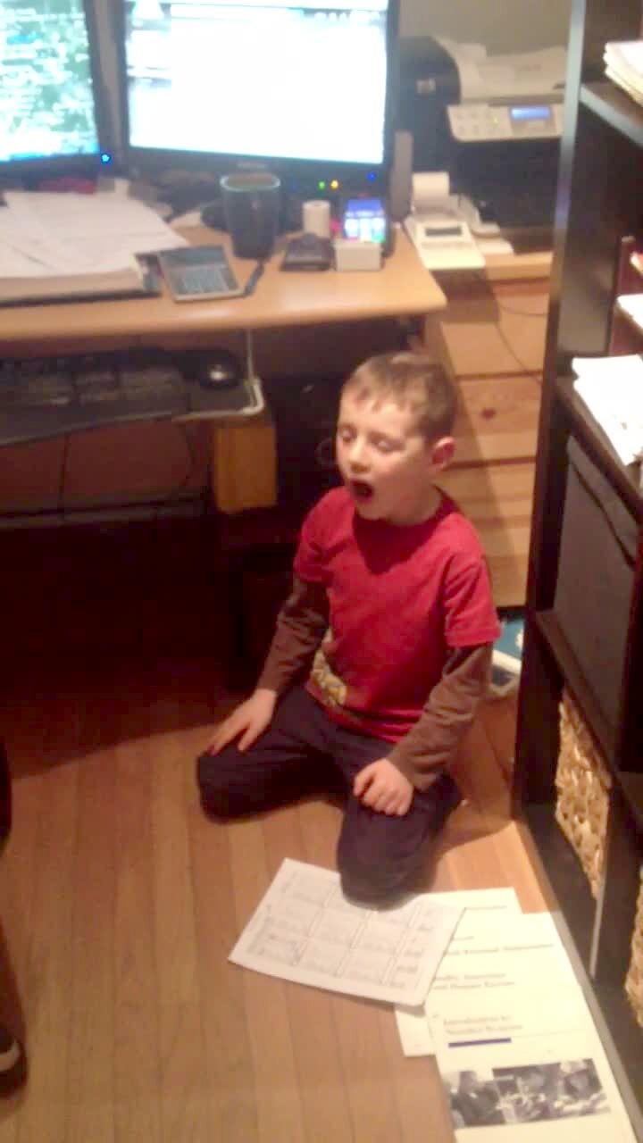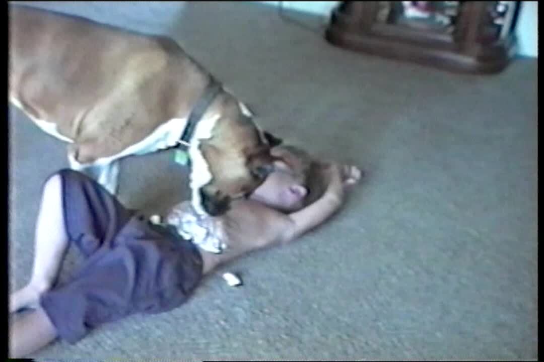A little boy is grossed out as a dog kisses his face indoors and spits in his mouth, amusing the girl behind the camera. Gross.