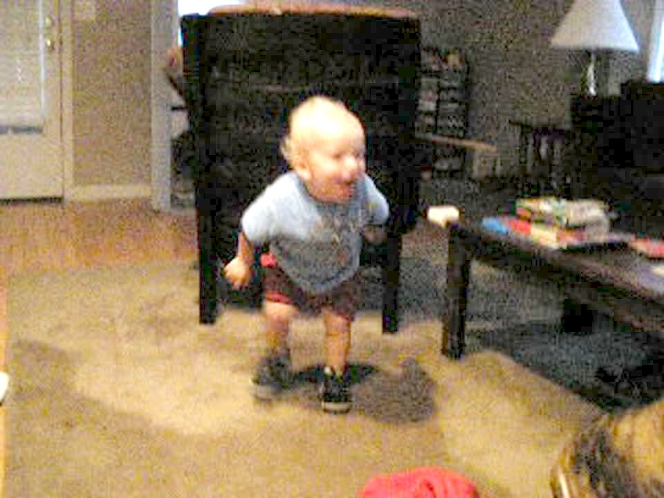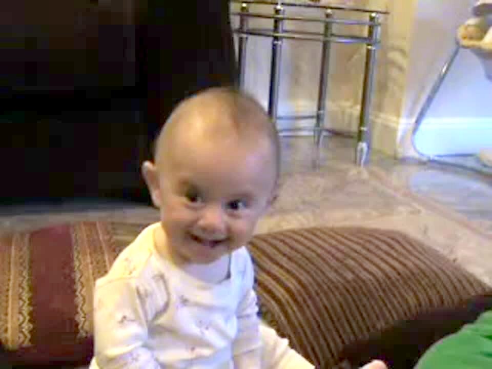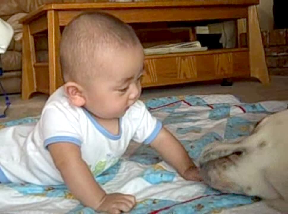 Baby boy laughing at a dog. Has a very loud, funny laugh.