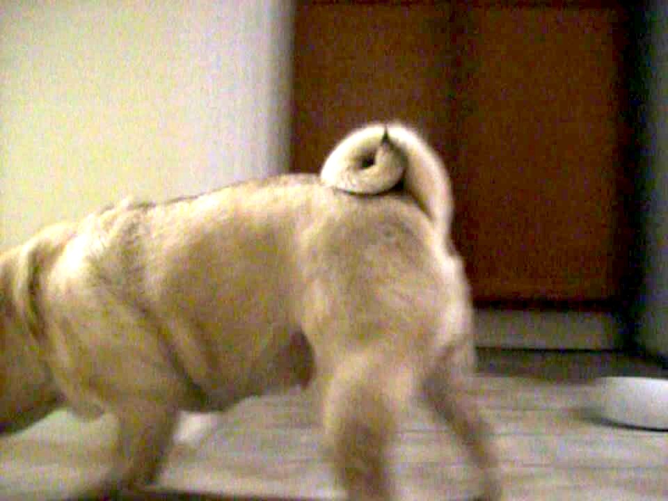 Puppy eating from bowl on floor flips over and spills food. Dogs.