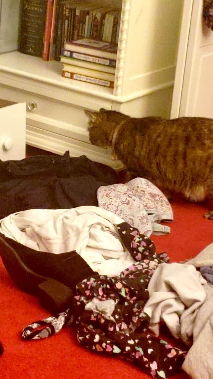 A mouse runs off of a bed after a cat drops it out of her mouth while a woman and young girl scream.