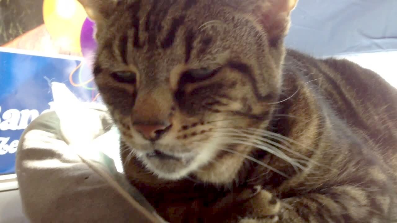 A woman starts singing as she lays in bed indoors. A cat dislikes it and starts biting her one the forehead.