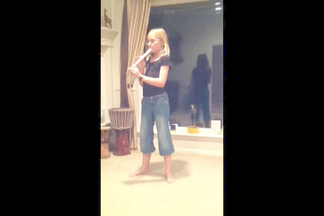 A little girl is playing recorder. A cat walks up to her and attacks her ankle.
