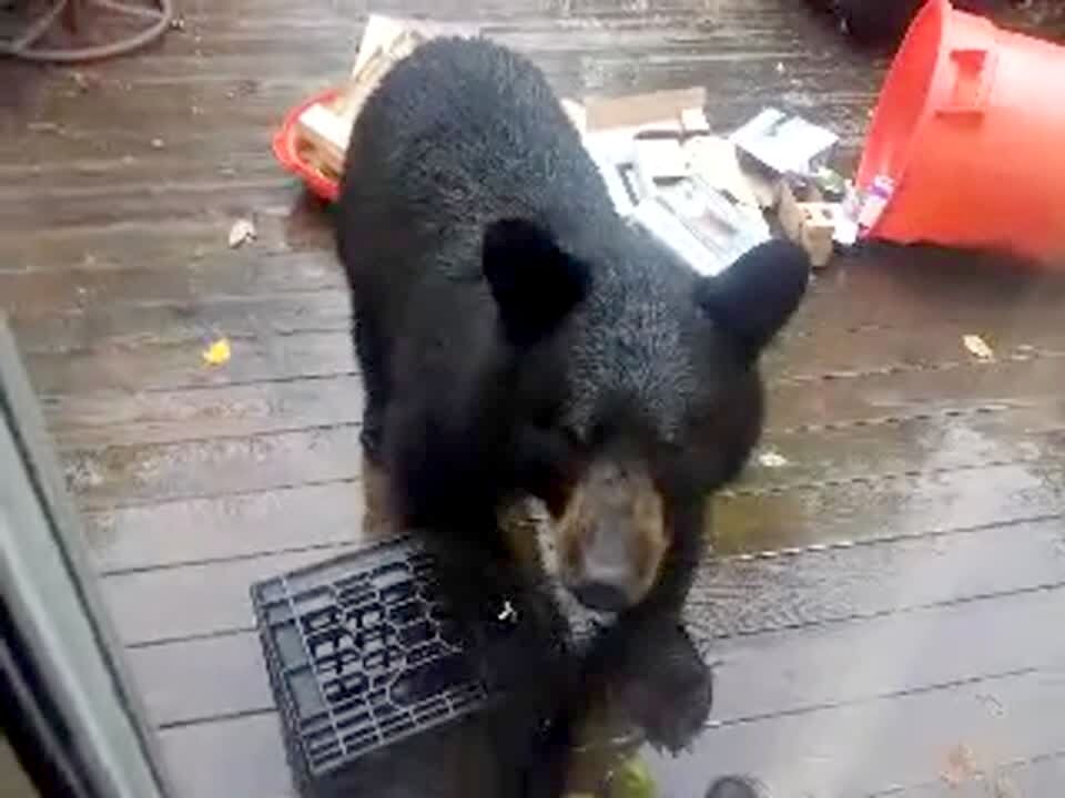 A man yells at a bear on a back porch through a glass door. The bear picks up a basket of pears and walks away with it.