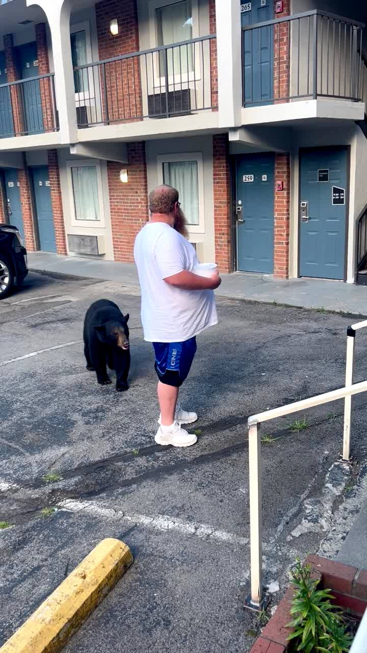 A man stands still in a hotel parking lot while a black bear approaches him, sniffs him, and walks away
