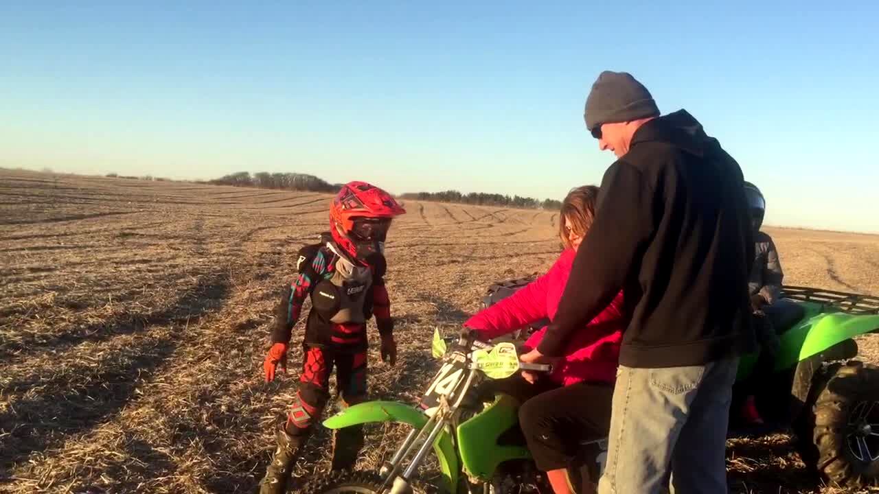 A woman tries to ride a motorized dirt bike but stands up and crashes and falls down outdoors.
