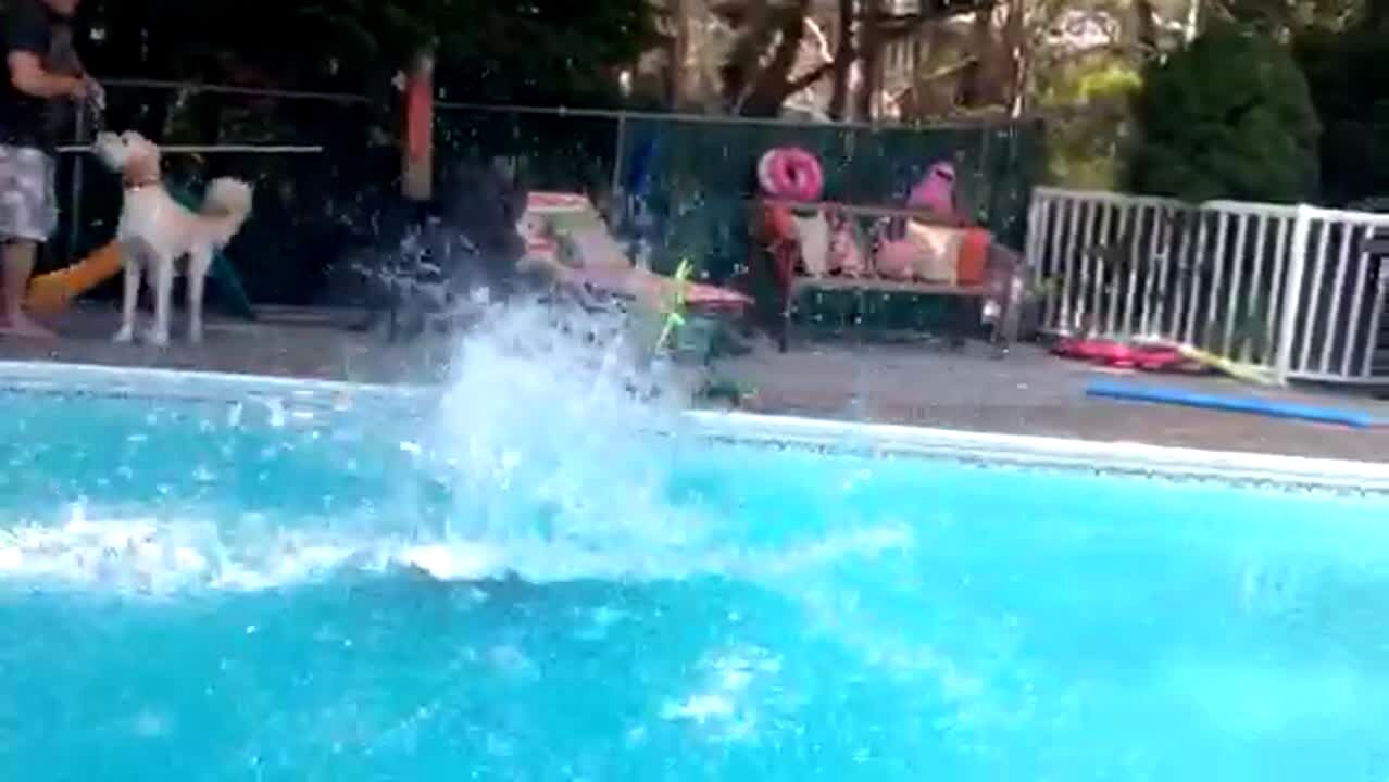 A woman rides a children's bike beside a pool when the back wheel breaks off and she falls into the water.
