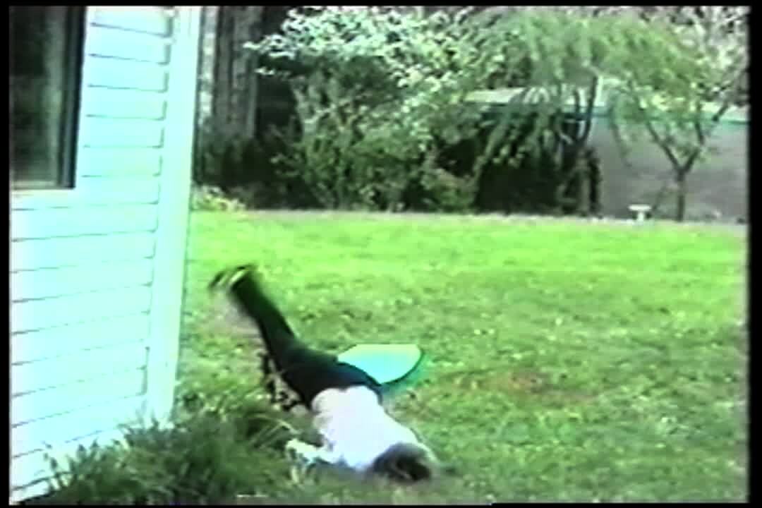Mom rides a mini bike down a pier at the lake and can't stop at the end of the dock, she falls into the water with the bicycle. Bonehead. Possible set up.