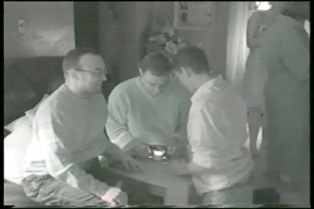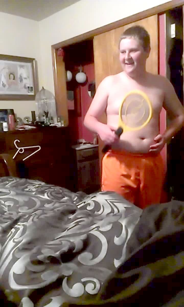 A shirtless teen boy struggles to get the courage to electrocute/ zap/ shock his nipple with an electric bug swatter while his family encourages him. Someone throws a pillow at him at :56, he shocks his nipple, and screams.