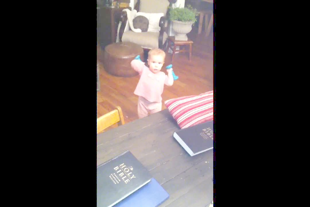 Baby girl lays on the floor with small dumbbell weights. She picks them up, stands by a table, and falls down from the weight of the dumbbells. Short tails. Exercise.