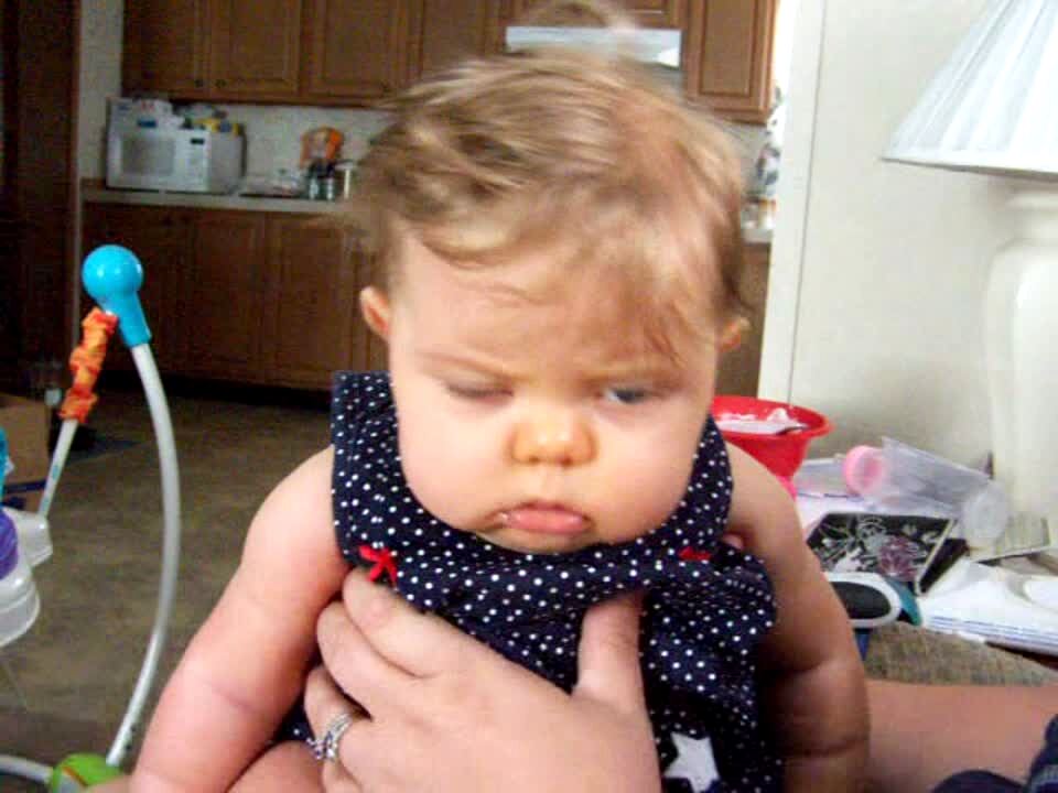 A baby girl falls asleep as her mom holds her on her lap indoors. Her parents call her name and she wakes up briefly and repeatedly before falling back to sleep. Her dad makes snoring noises and her eyes go wide as she looks at the camera before she quickly falls back asleep.