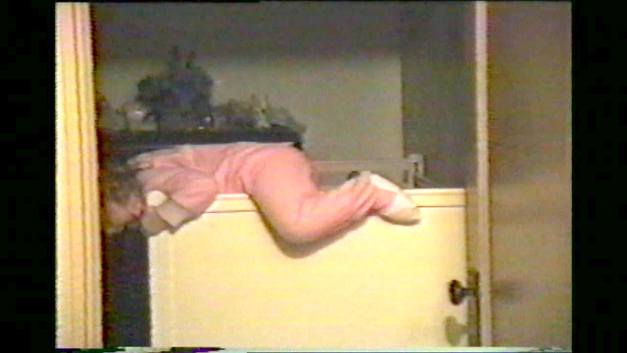 Baby girl attempts to crawl out of crib, falls back in.