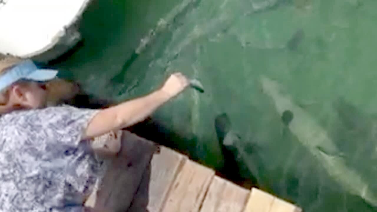 A large tarpon jumps out of water outdoors when a woman dangles a treat to feed the fish.