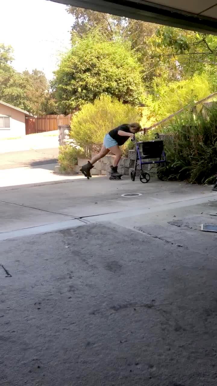 A woman walks onto a yard and opens a barbecue grill, then flames rise up out of it, and her hair smokes. Security footage.