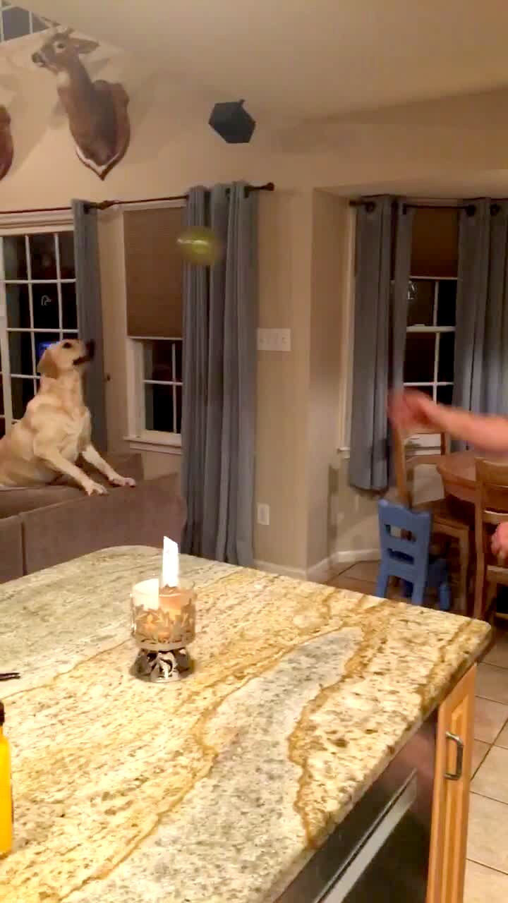 A Golden Retriever dog licks a pan, then his collar gets stuck in it and it makes a loud clatter sound as he runs out of a kitchen. Security camera footage.