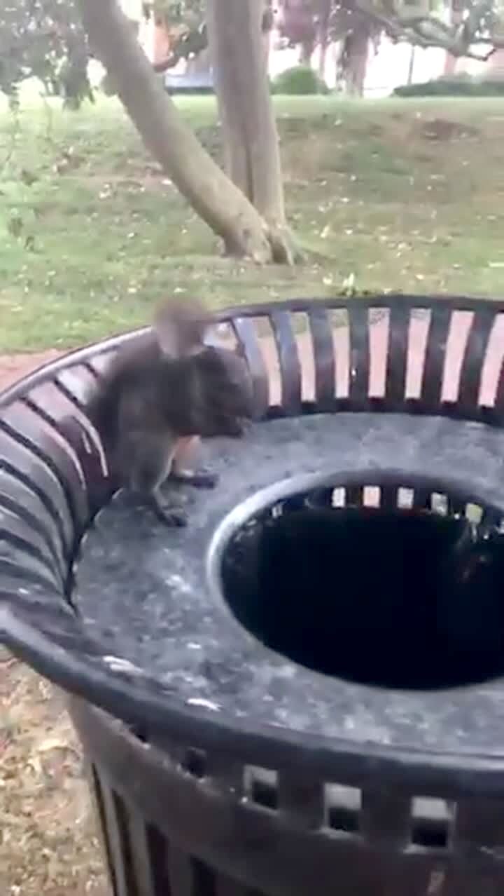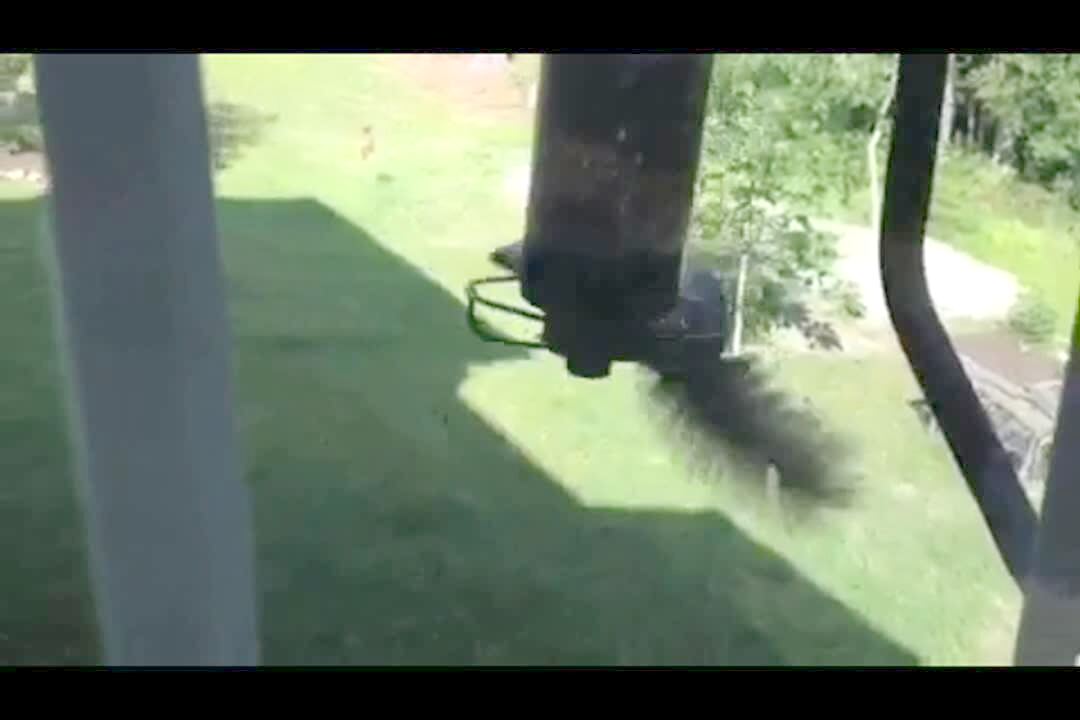 A squirrel is stuck inside a bird feeder until a woman lets it out.
