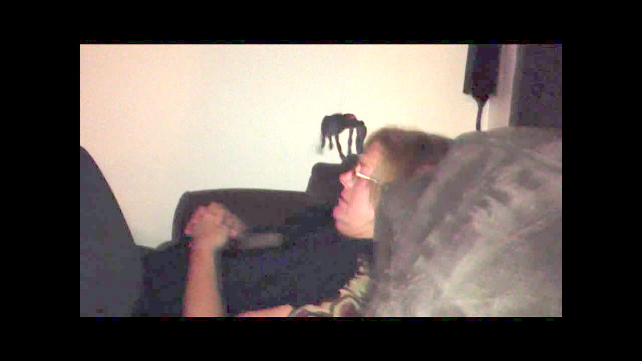Practical jokes; son drops big fake spider on mom when she goes up stairs, mom screams. Mom is in nurse's outfit.