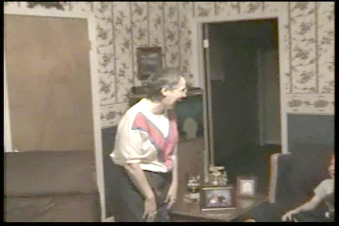 Montage of older woman getting scared / startled in and around the house, she says "ooh" each time. Clip has many cuts & edits, practical joke.