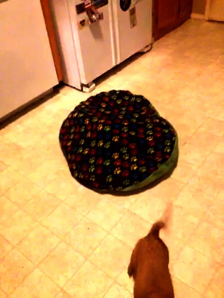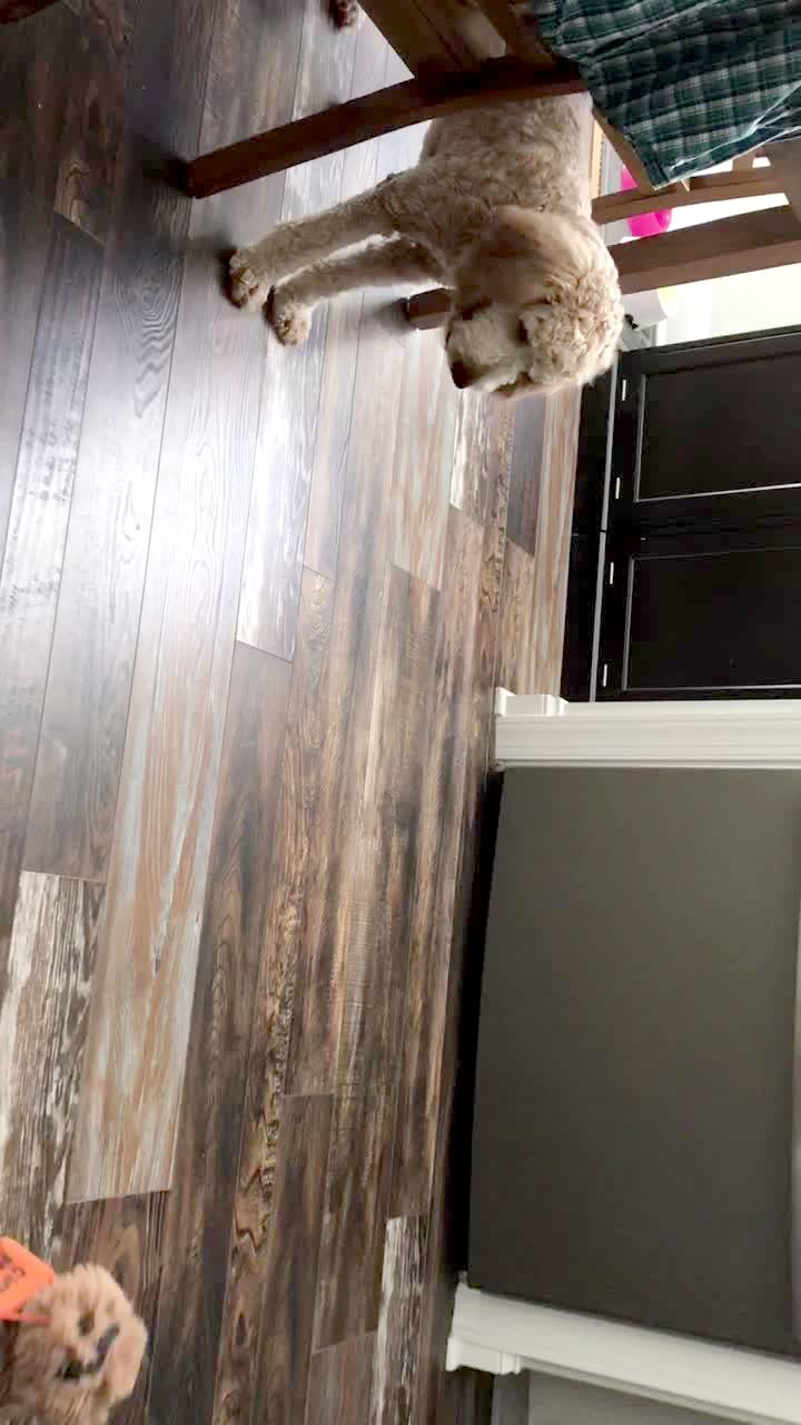 A treat bounces off a dog's mouth in slow motion, it looks around for it on the floor, then another dog takes it and runs out of the room.