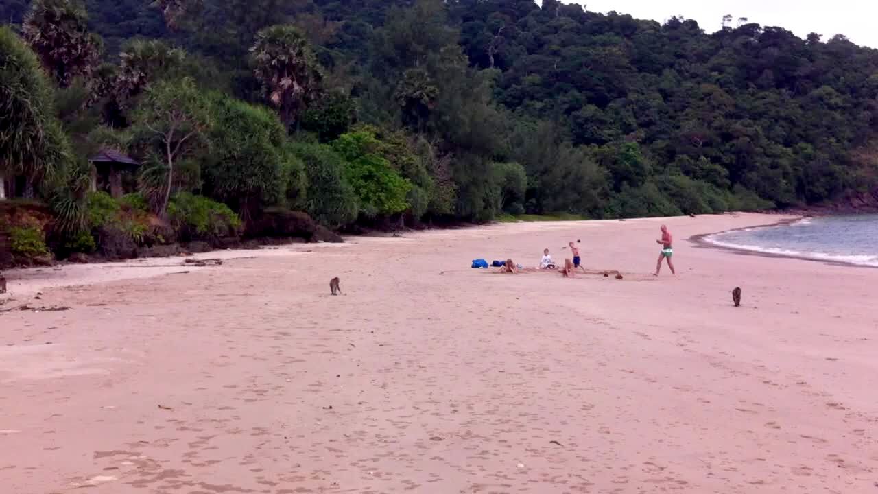 Two monkeys on a beach head for a family camping out on the sand. One monkey distracts the people while the other monkey steals food from them.