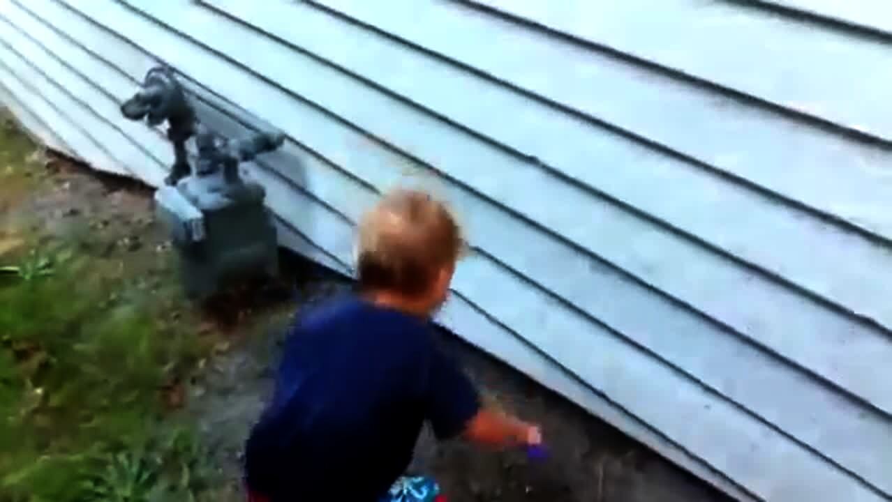 A tot boy rides a toy car in the backyard, looks at a drink on the arm of a patio chair and hits it onto the ground, then his father stares and says, "Dang son."