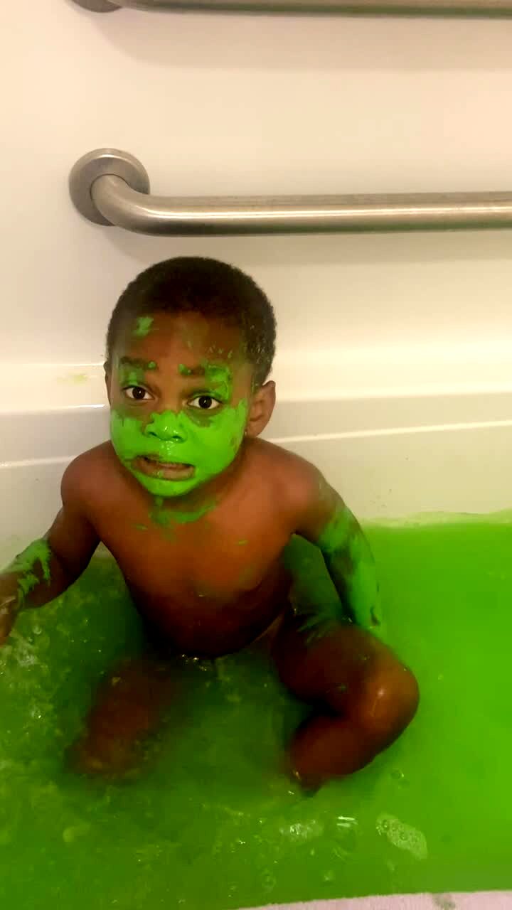 A young boy paints with green paint all over a house then says "cheese" as his mom shows him in the bathtub with green paint all over his face and tub.