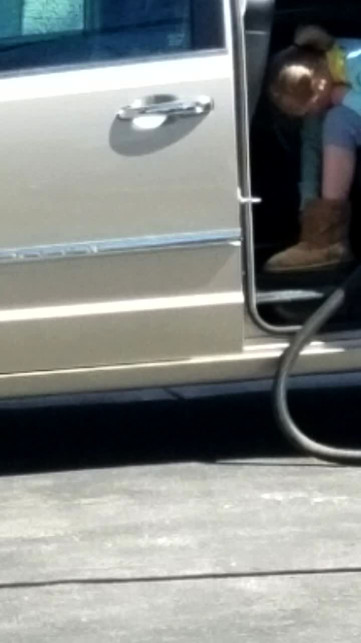 A young girl tries to vacuum the inside of a car in the driveway while the hose is detached from the rest of the vacuum.