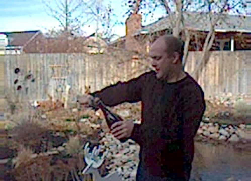 Man tries to break a bottle of champagne in the garden with a small Samurai sword, the bottle breaks all over the deck. Bonehead.