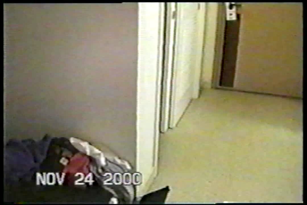 A man spills two drinks at the front door then throws the third on the ground and swears. Security footage.