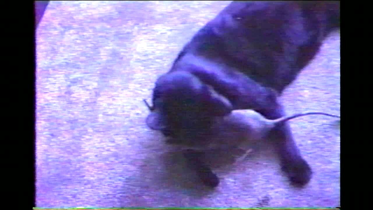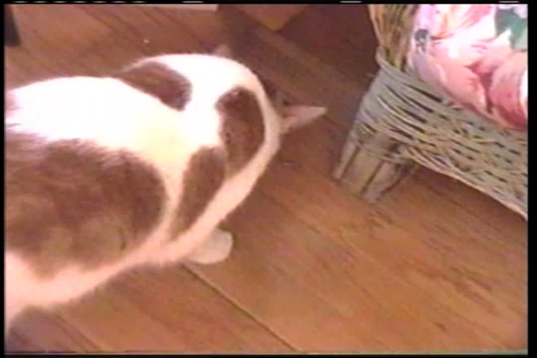 "Rodent Rascal" Brown & white cat tries to get mouse, mouse lays on its back & plays dead and escapes. Shaky camera.